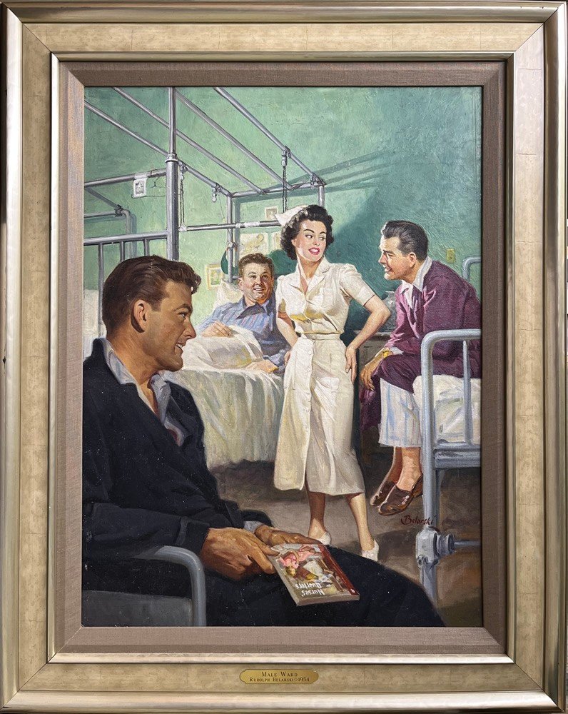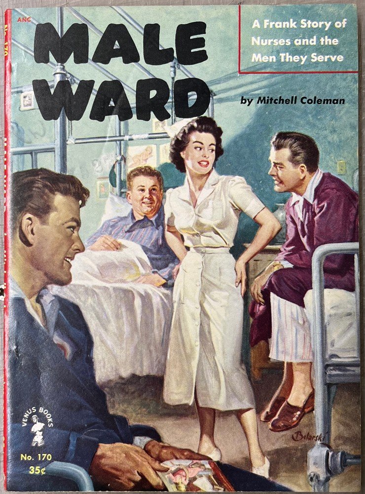 Comment: When I was at Illustration House ages ago, this piece was there too, for a time. I’ve always liked it. In particular I like the fact that one of Belarski’s previous efforts for sister publisher Cameo appears in the hands of the guy in the foreground— specifically Nurses Quarters by Sylvia Erskine. Includes a vintage copy of the MALE WARD paperback. Interesting that the paperback cover is cropped a bit to not show the other title.