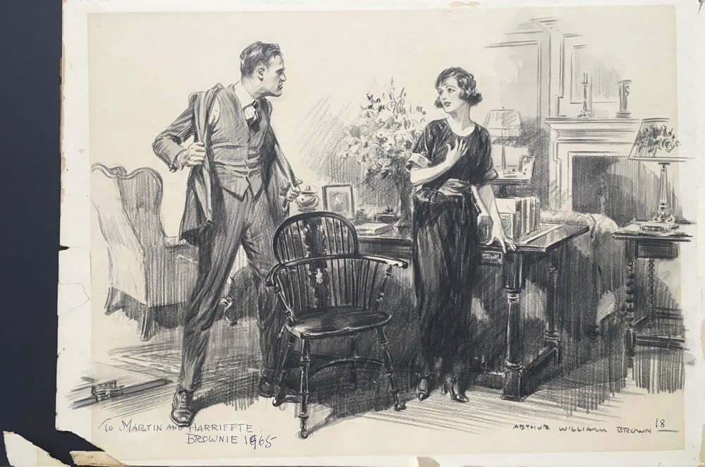 Comment: Part of what any illustrator did was use their own visual memory and other sources to come up with characters, poses and narrative for their assignments. Remember too that the 1910's and 1920's were far from a desert in terms of richness of visual input. Sure, we're bombarded by imagery today and it's easy to chalk that up to the internet, but in the first couple decades of the 20th century there were scores of places to see all manner of Illustration in print… a world in which we no longer live. In the case of this specific piece, you'll want to consider James Montgomery Flagg's “Tell That to the Marines!” recruitment poster that he famously created on the steps of The New York Public Library. While the Brown has been here for some time, it wasn't until the day that I wrote this description that I actually purchased a copy of the magazine to accompany, so while I don't yet have the caption, the magazine is still included in the purchase price. Inscribed to Martin and Harriette, 1965.