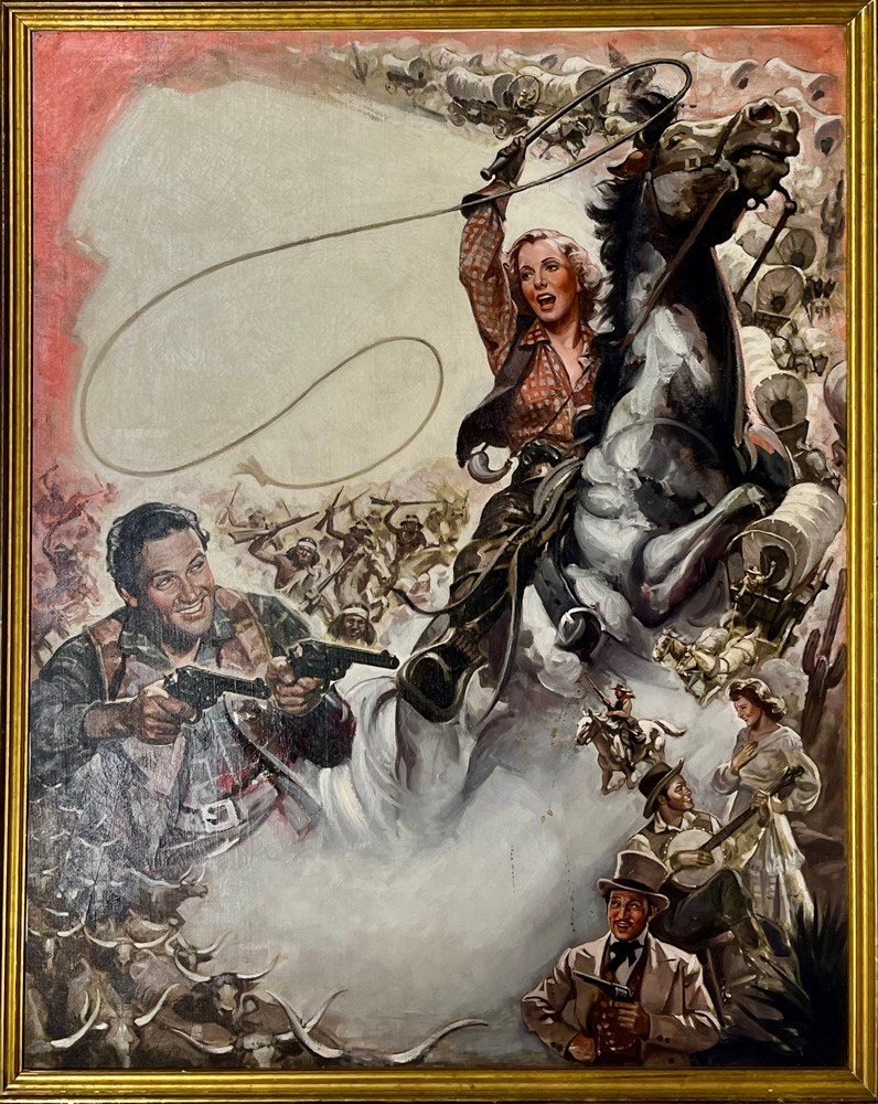 Comment:  A really nice example of pre-War movie advertising art. Oftentimes, and especially with regards to Western art, I find myself critical of the “200 Things Going on at Once” school of illustrating. That said, when there’s the implied passage of time involved, it not only makes sense, but works. Film directed by Wesley Ruggles (1940) based on the serialized C.B. Kelland story which appeared in The Saturday Evening Post in 1939. The magazine story was also illustrated by Clark and it’s partly on that basis that I attribute this work to him. The movie poster was published in a couple different forms and as was typical, elements of the composition were repositioned for the poster(s). I’ll show one, though I don’t have the printed piece to accompany the art’s purchase.