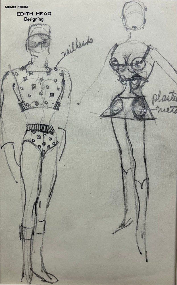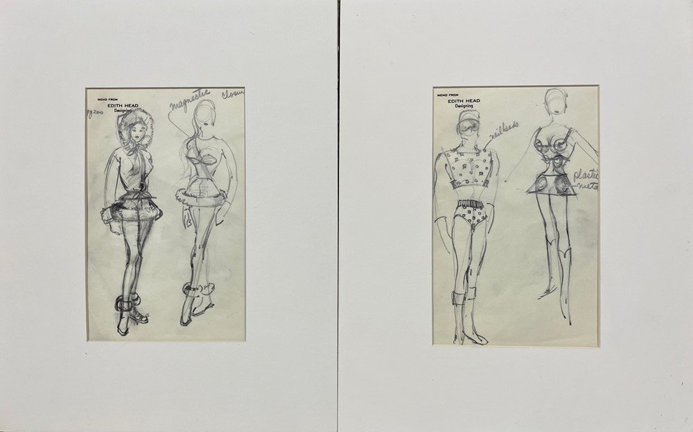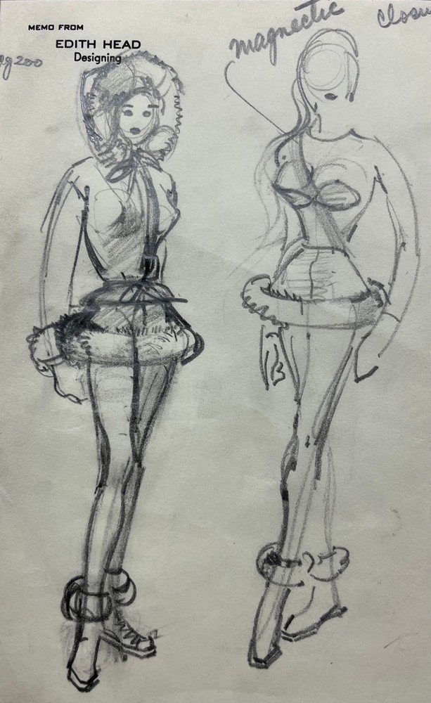 Comment: Edith Head’s originals have come to market often enough to keep her abilities in the public’s consciousness. As one (at least this one) would expect, the more famous the actress and role, the better the price. Certainly the fact that Barbarella is an iconic film should mean that this one won’t last on my website. Sorry, I don’t want to split them up. On EDITH HEAD DESIGNING memo paper. Film starred Jane Fonda and was directed by Roger Vadim.